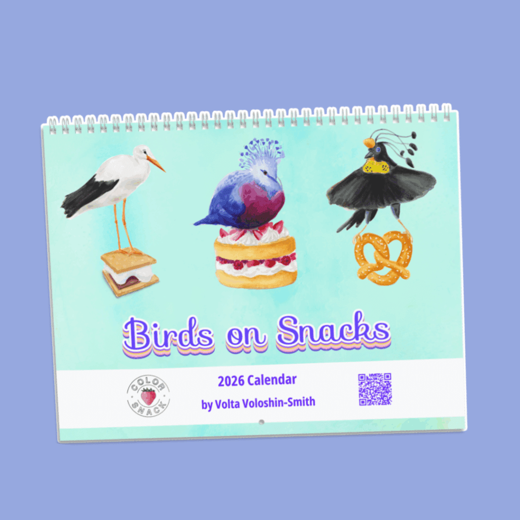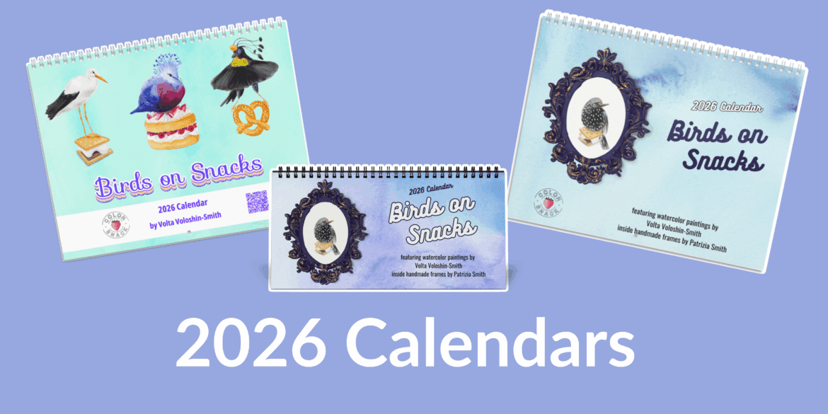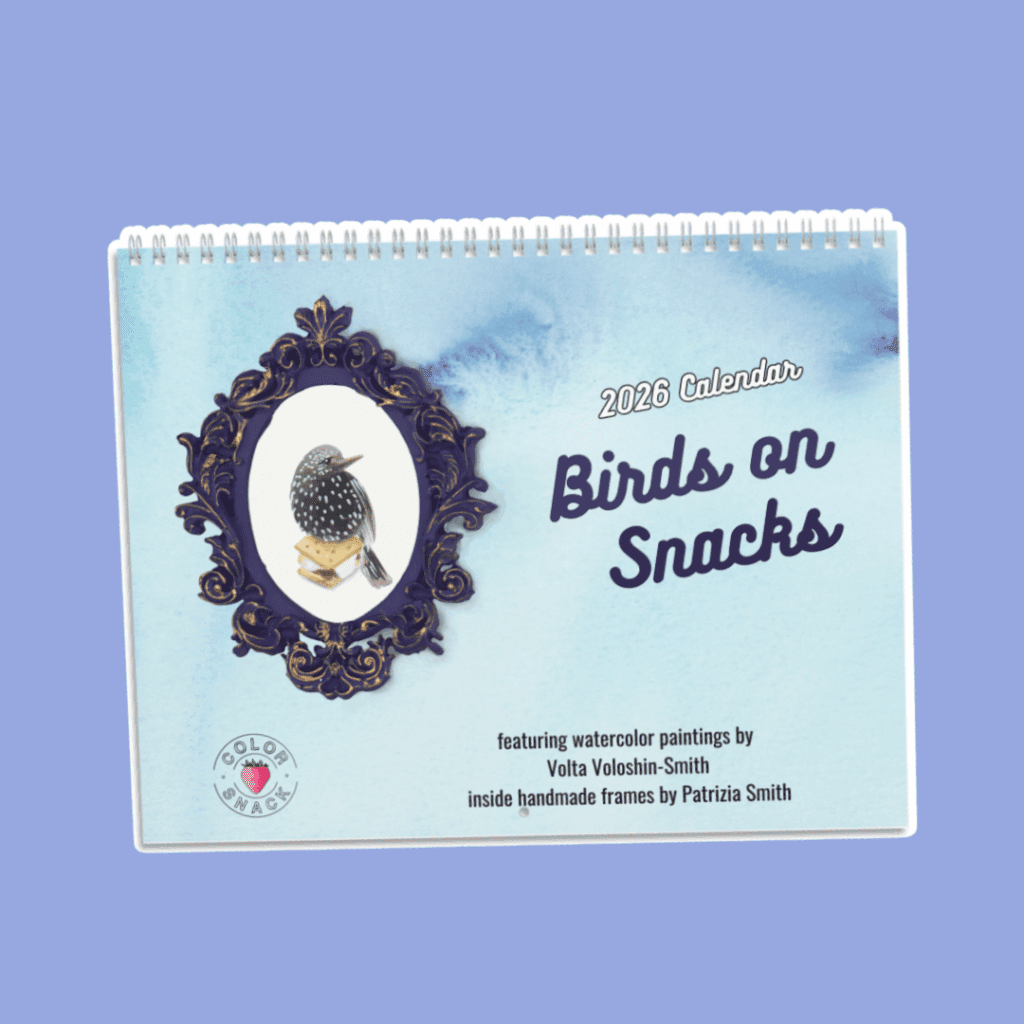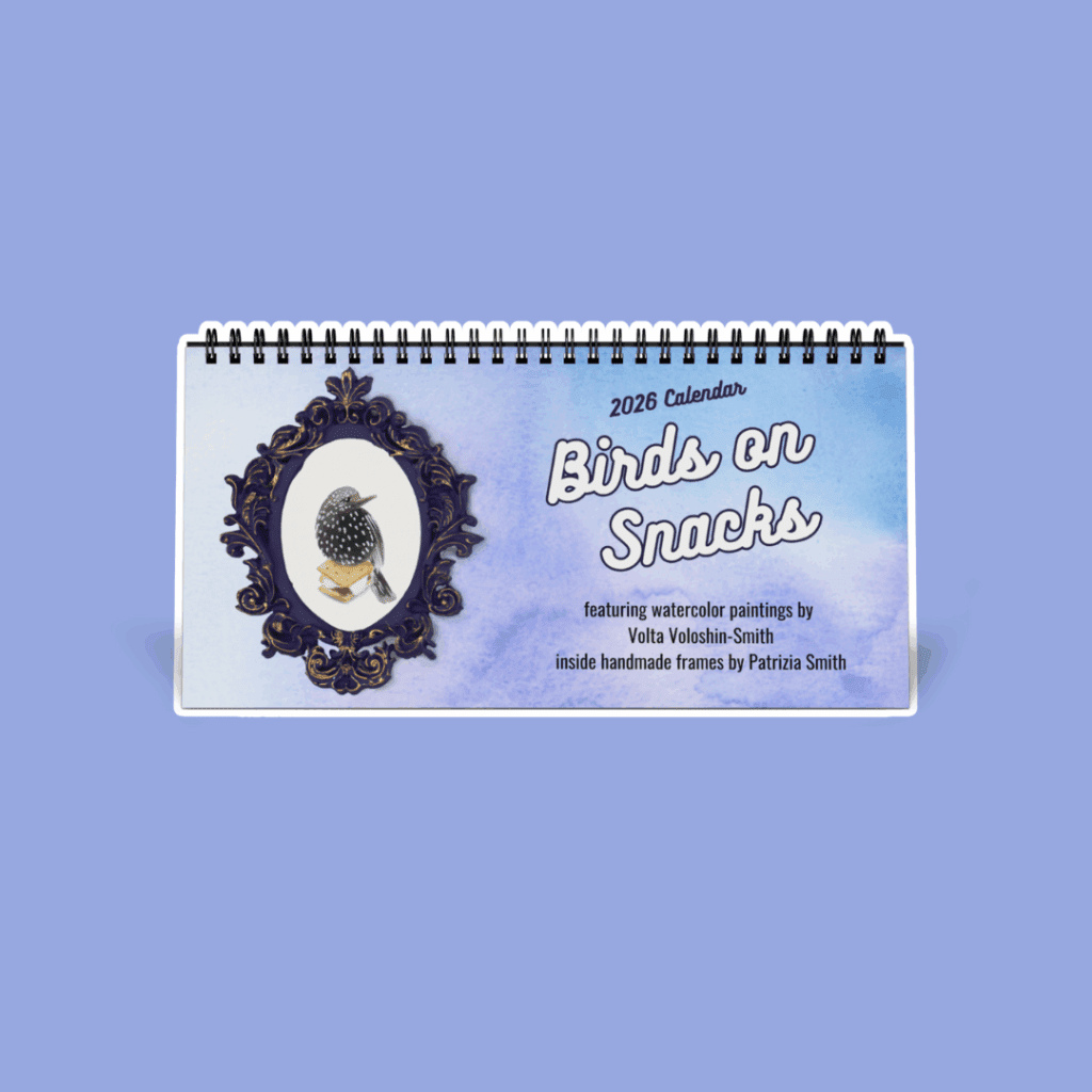 Birds on Snacks – 2026 Calendar by Volta Hi sweet friend! I have several calendar options this year. BEST OF version, 2026 calendars with Birds on Snacks from previous years. Tiny Birds on Snacks, from my current series of 100 tiny birds inside handmade frames. Desktop version. Shop Birds on Snacks desktop calendar Share FacebookTwitterPinterestEmail